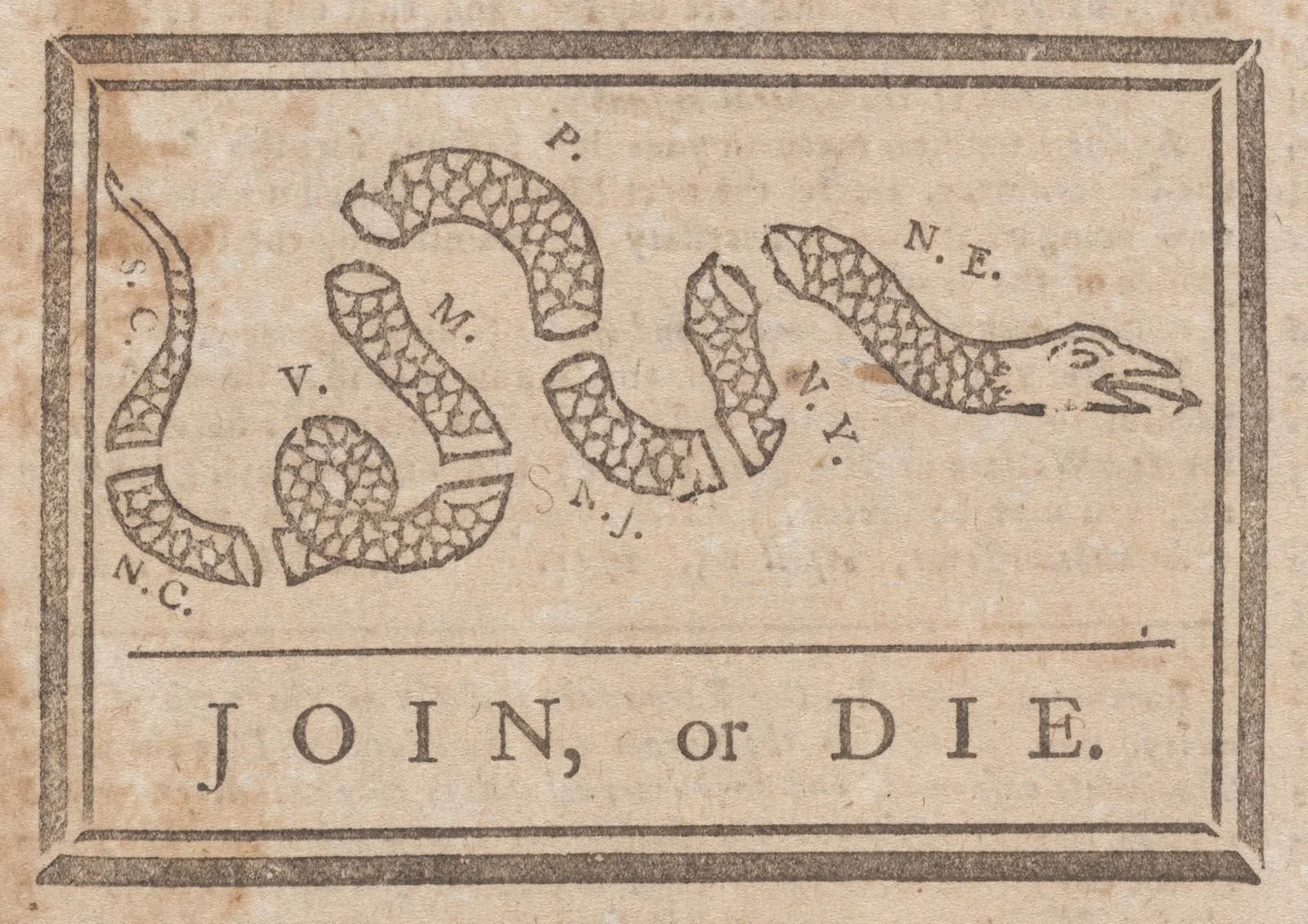 If you turn the cartoon sideways, with the snake’s head pointing up, you can see that colonial parts of the snake mirror the sequence of colonies from north to south. The curves in the snake’s body also resemble the shape the eastern seaboard. Franklin also drew on colonial folk wisdom to add layers of meaning to his cartoon; popular belief had it that if one cut a snake into pieces it was capable of re-assembling itself and rising from the dead.
